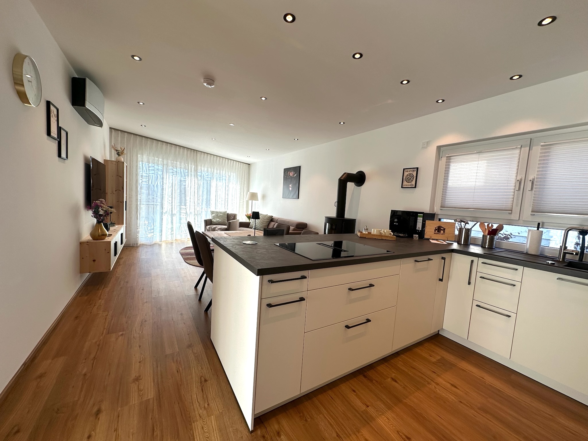 Das Haus verfügt über einen einladenden Flurbereich mit Garderobe und Zugang zum Bad mit Dusche im Erdgeschoss. Die voll ausgestattete Küche lädt zum gemeinsamen Kochen ein und die Kaffeemaschine von Jura zu einer kleinen Kaffeepause.